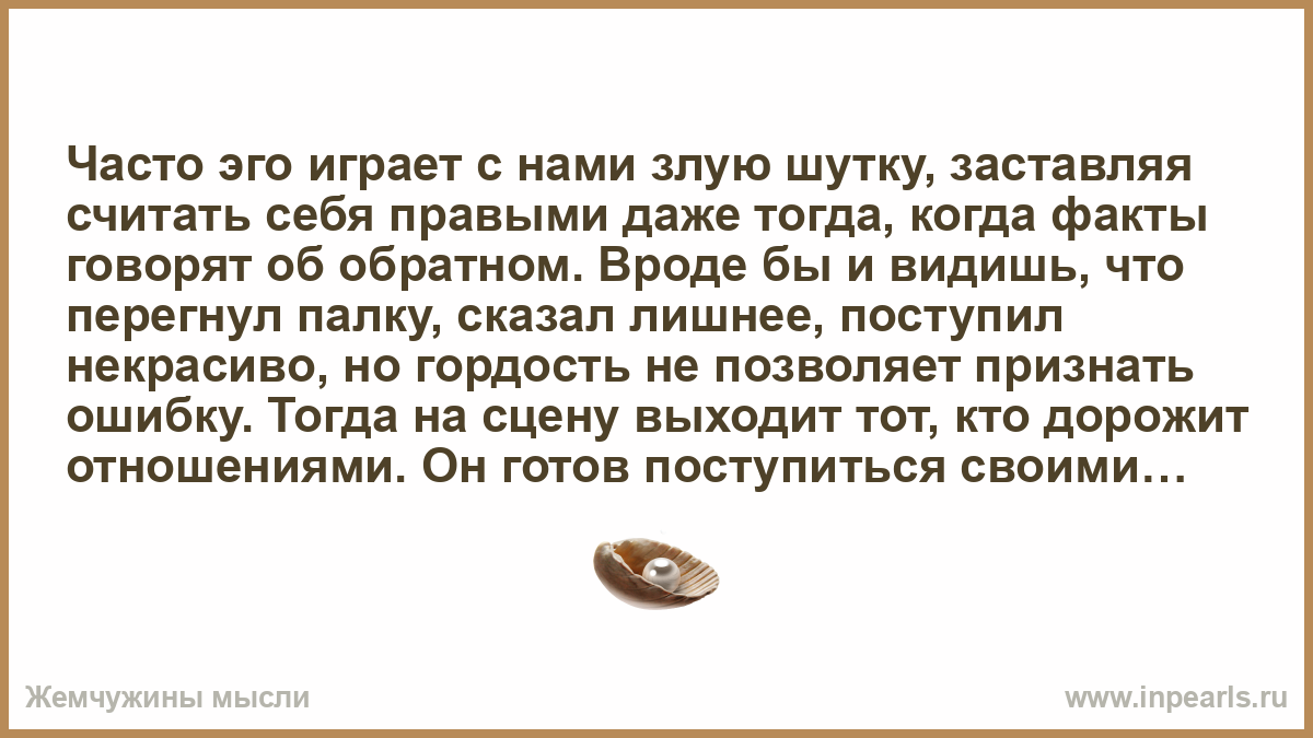 Часто эго играет с нами злую шутку, заставляя считать себя правыми даже тогда, когда факты говорят об обратном. Вроде бы и видишь, что перегнул палку, сказал лишнее, поступил некрасиво, но гордость не позволяет признать ошибку. Тогда на сцену выходит тот, кто дорожит отношениями. Он готов поступиться своими принципами, переступить через свою уязвленную гордость, лишь бы не потерять связь с близким человеком.