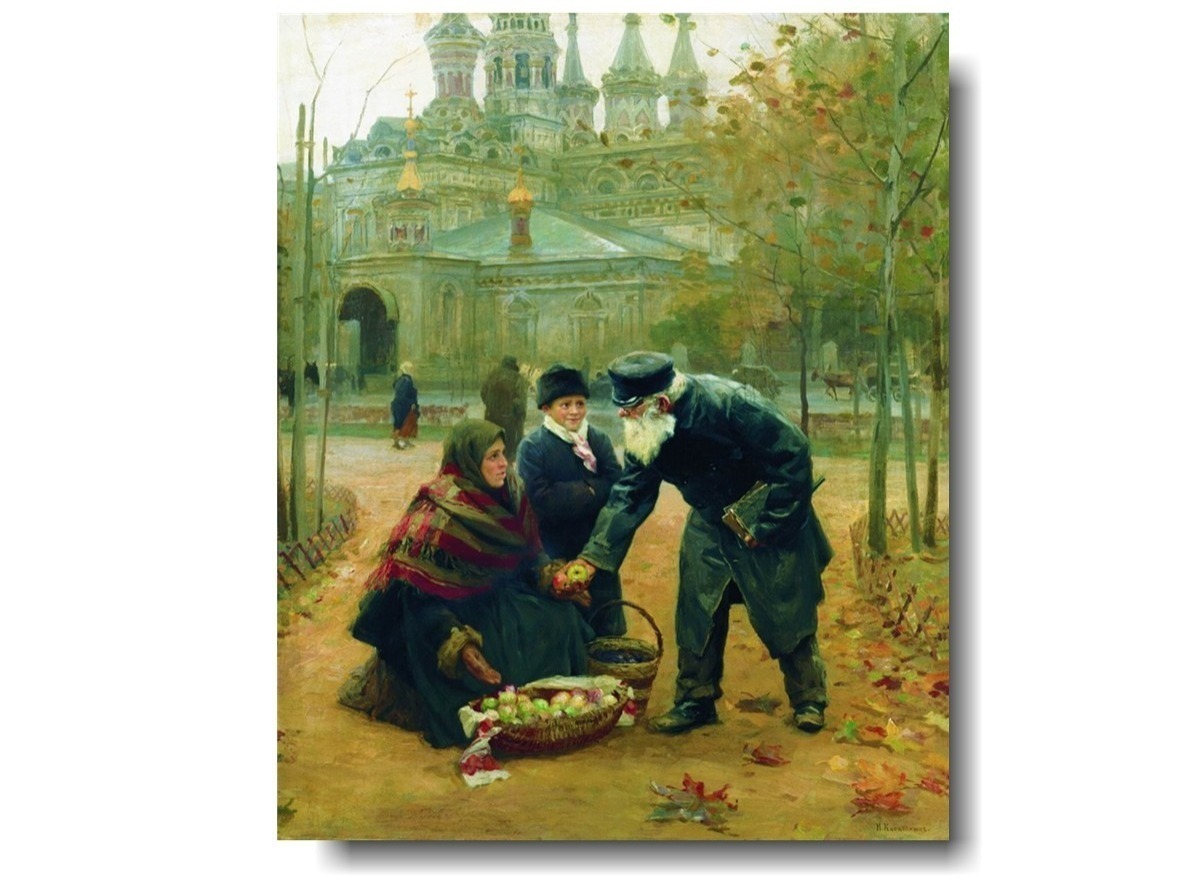 Само название картины подсказывает, что старик покупает яблоки не для себя, а чтобы угостить мальчика, во взгляде которого читается восторг и обожание.