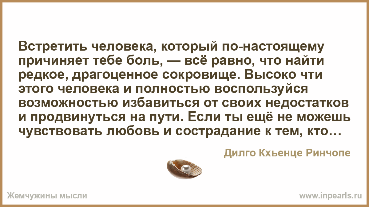 Встретить человека, который по-настоящему причиняет тебе боль, — всё равно, что найти редкое, драгоценное сокровище. Высоко чти этого человека и полностью воспользуйся возможностью избавиться от своих недостатков и продвинуться на пути. Если ты ещё не можешь чувствовать любовь и сострадание к тем, кто плохо с тобой обращается, это признак того, что твой ум пока не полностью преобразован, и тебе следует работать над ним с удвоенным усердием.