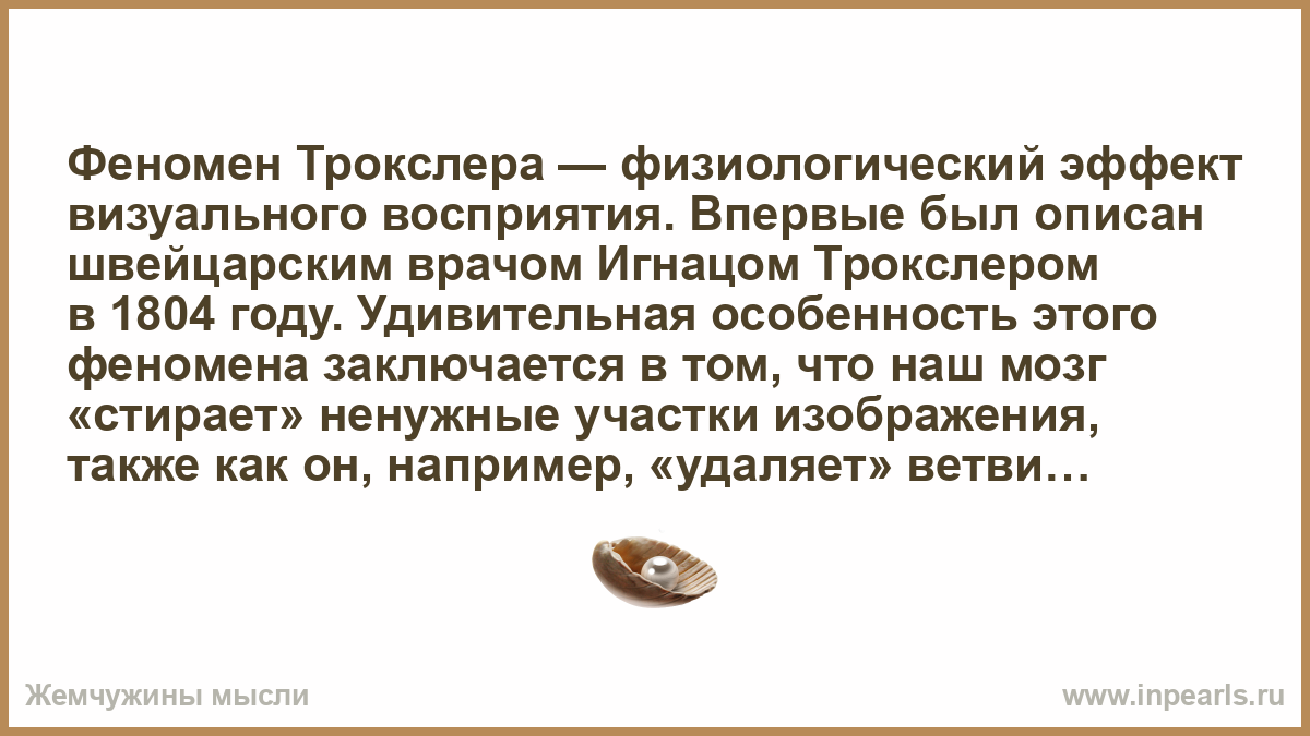 Кроме этого, мозг убирает неподвижные объекты, которые длительное время находятся в поле нашего зрения. При этом объект просто сливается с фоном и становится неразличимым. Однако, как только вы измените угол зрения или моргнете, объект снова станет видимым. Эффект Трокслера наблюдается не только у человека, но и у позвоночных животных.