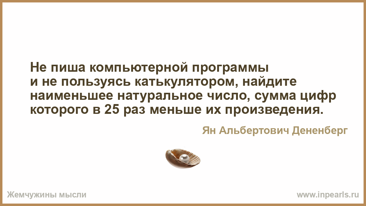 Не пиша компьютерной программы и не пользуясь катькулятором, найдите наименьшее натуральное число, сумма цифр которого в 25 раз меньше их произведения.