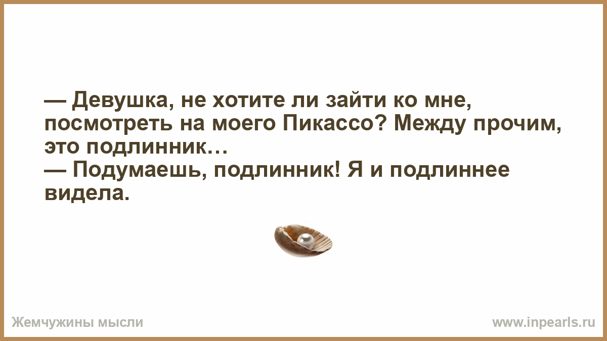 — Девушка, не хотите ли зайти ко мне, посмотреть на моего Пикассо? Между прочим, это подлинник…