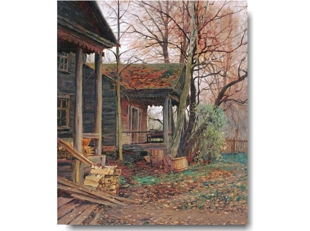 Старый деревянный дом стоит задумчиво, словно сам стал свидетелем бесконечной смены времён. Крыльцо с потемневшими ступенями, покосившиеся вёдра, поленница у стены — всё говорит о простоте и буднях деревенской жизни. Но над этим повседневным скромным пейзажем разливается особая поэзия осени.