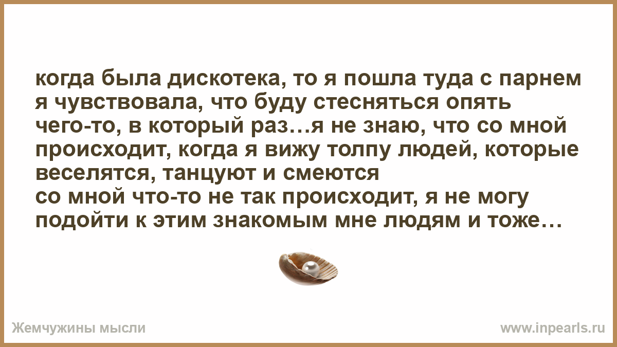 я чувствовала, что буду стесняться опять чего-то, в который раз…я не знаю, что со мной происходит, когда я вижу толпу людей, которые веселятся, танцуют и смеются