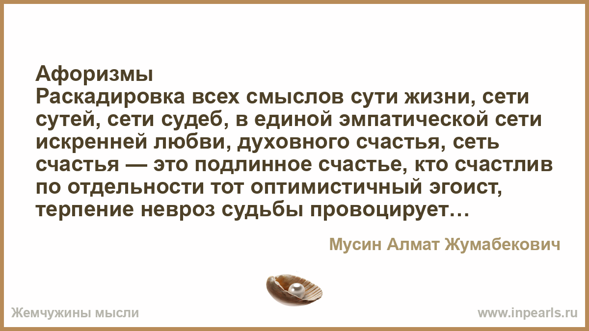 Раскадировка всех смыслов сути жизни, сети сутей, сети судеб, в единой эмпатической сети искренней любви, духовного счастья, сеть счастья — это подлинное счастье, кто счастлив по отдельности тот оптимистичный эгоист, терпение невроз судьбы провоцирует откровенничать или сдаться, тишина эгоизма алчного, трусливого, нарциссического коварства, движутся континенты истории человечества — это нестабильный эгоизм алчной трусости, лунатизм забвения, заря молодости бессмысленного рвения, не имея озарения, современная культура подвергает постоянной мутации сознание человека, ментизму пустословия, честный, прямолинейный анархист парящий в абсолютном бесстрашии, соматическая цикличность подсознание движется по определенным бинарно алгоритмичным фазам поведения человека, У людей слепое монотонное влечение к материи мотивация — это потенция, потенциал, эрекция оптимизма, слепого грешного энтузиазма, счастье это то что мы в себе постоянно подавляем, а когда устаем, оно растет вновь, выживание это отвлекающий маневр от понимания жизни, их прошлое гниет отговорками и домыслами, и лживым воображением, их будущее гниет бесполезными промыслами, а настоящее алчными помыслами, вор всегда беден, он ворует и не богатеет, судьбы подключены как к электростанции, питаются энергией сомнительных иллюзий, закономерности как электропровода импульсивного слепого оптимизма, дизайн внутреннего мира, результат безрассудного воображения подсознания, лунатизм слепого забвения, у одиноких дам цинично-алчная члено-фобия (боязнь пенисов, ответственности за рождения ребенка), рынок предателей в растущем кризисе, иерархия лицемерных предателей систематических алчных предателей,