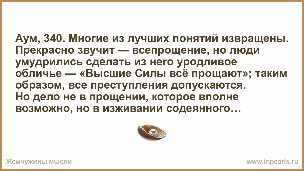 Аум, 340. Многие из лучших понятий извращены. Прекрасно звучит — всепрощение, но люди умудрились сделать из него уродливое обличье — «Высшие Силы всё прощают»; таким образом, все преступления допускаются. Но дело не в прощении, которое вполне возможно, но в изживании содеянного.