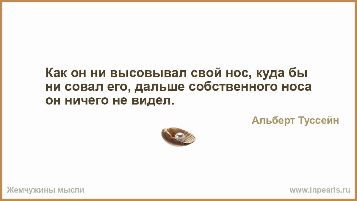 Есть люди, которые «дальше своего носа ничего не видят»; а наткнувшись на свой длинный невзрачный нос, восклицают: «Боже, какой прекрасный нос!», считая все чужие носы уродством…