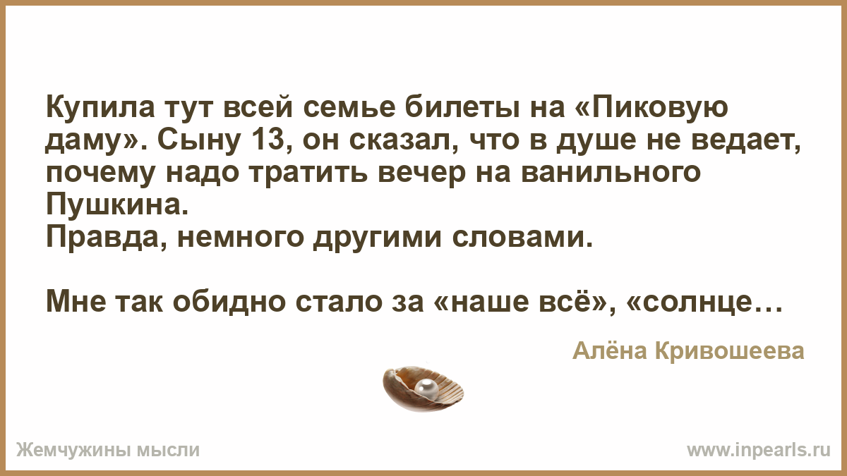 Купила тут всей семье билеты на «Пиковую даму». Сыну 13, он сказал, что в душе не ведает, почему надо тратить вечер на ванильного Пушкина.