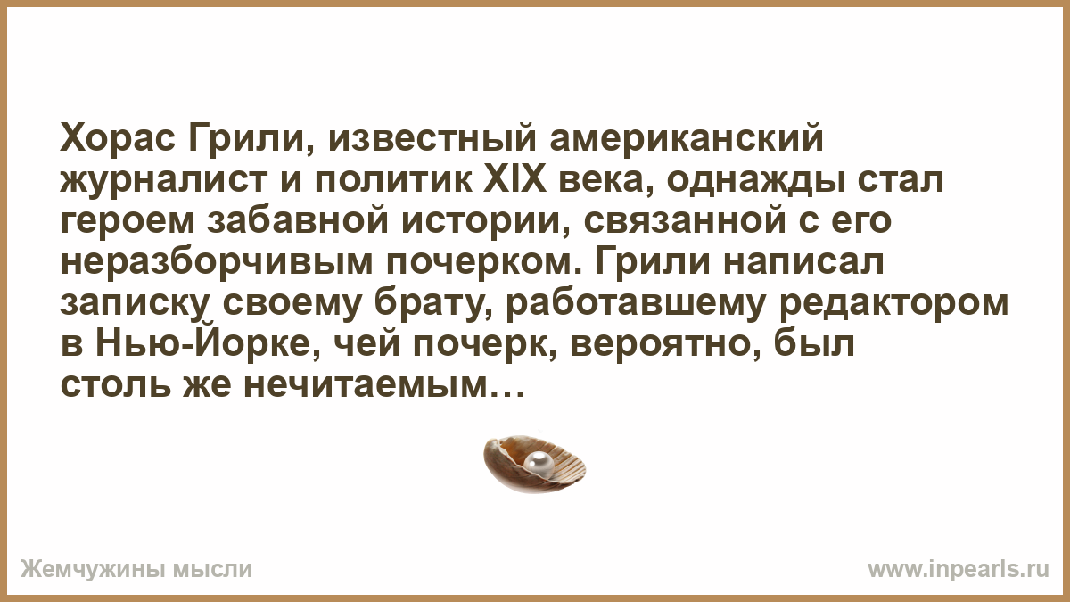 Хорас Грили, известный американский журналист и политик XIX века, однажды стал героем забавной истории, связанной с его неразборчивым почерком. Грили написал записку своему брату, работавшему редактором в Нью-Йорке, чей почерк, вероятно, был столь же нечитаемым.