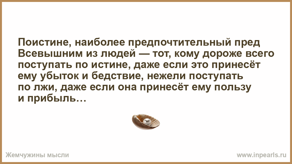 Поистине, наиболее предпочтительный пред Всевышним из людей — тот, кому дороже всего поступать по истине, даже если это принесёт ему убыток и бедствие, нежели поступать по лжи, даже если она принесёт ему пользу и прибыль.