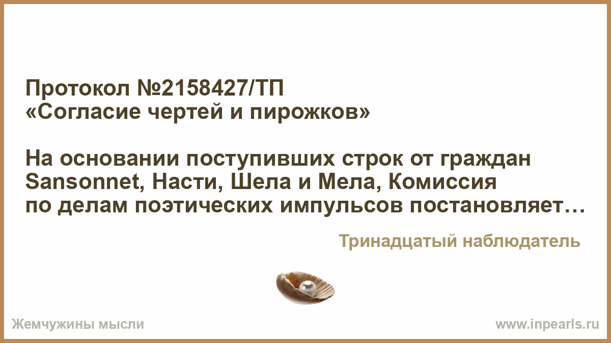 На основании поступивших строк от граждан Sansonnet, Насти, Шела и Мела, Комиссия по делам поэтических импульсов постановляет: