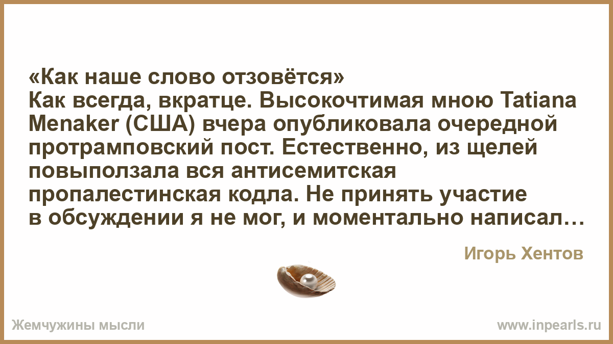 Как всегда, вкратце. Высокочтимая мною Tatiana Menaker (США) вчера опубликовала очередной протрамповский пост. Естественно, из щелей повыползала вся антисемитская пропалестинская кодла. Не принять участие в обсуждении я не мог, и моментально написал так:
