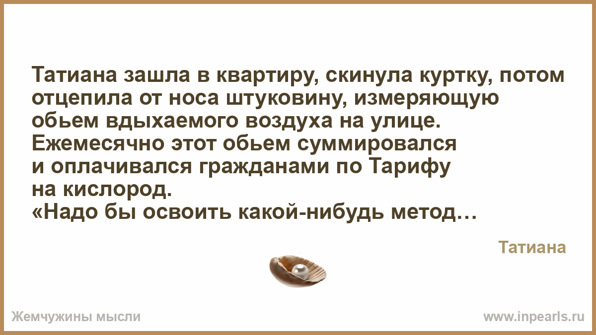 Татиана зашла в квартиру, скинула куртку, потом отцепила от носа штуковину, измеряющую обьем вдыхаемого воздуха на улице. Ежемесячно этот обьем суммировался и оплачивался гражданами по Тарифу на кислород.