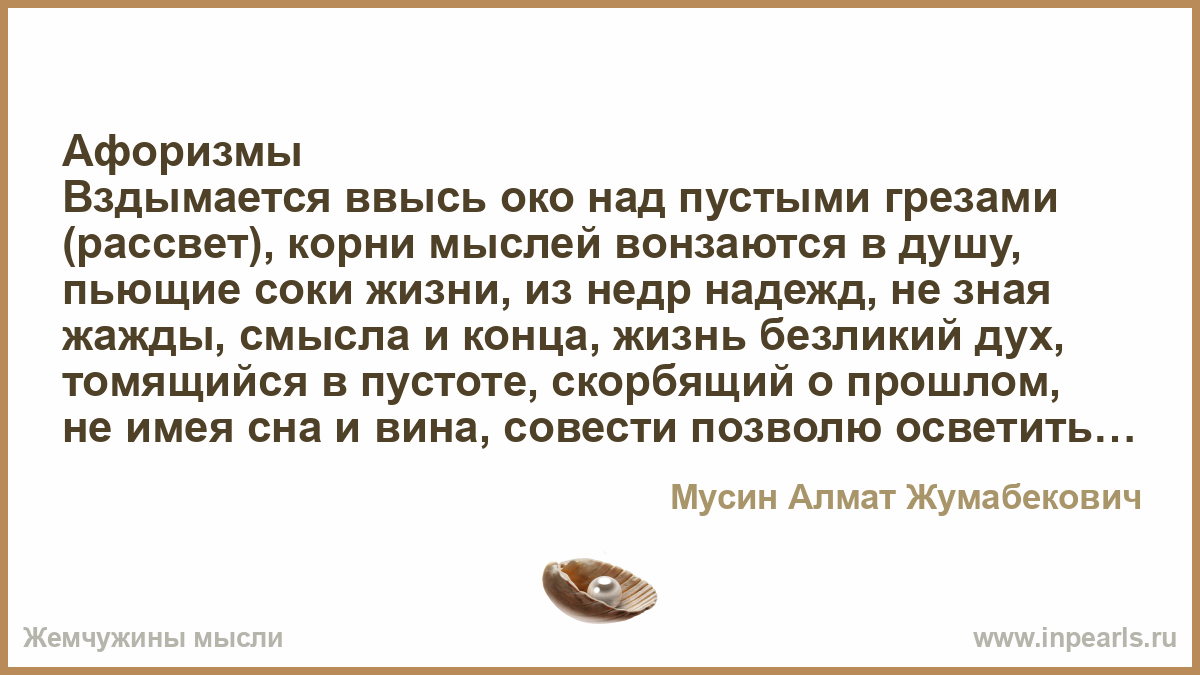 Вздымается ввысь око над пустыми грезами (рассвет), корни мыслей вонзаются в душу, пьющие соки жизни, из недр надежд, не зная жажды, смысла и конца, жизнь безликий дух, томящийся в пустоте, скорбящий о прошлом, не имея сна и вина, совести позволю осветить мой путь, капли смысла в ее лучах, я смиренно душой вкушаю, Зовут алчные лжецы себя спасением, собирают жнецы мертвый урожай, бросают крошки в голодные массы своего народа, глашатаи (телевиденье) лгут не зная жалости, умиляют, восславляют они чужие грехи, постыдный путь избрали они, купят они горсть лжецов в придаток, чтобы мирскими благами кормится, стареют алчные нарциссы как цветы в саду, которые заменят другими, Мне кажется все более чужими, и в речах скупым, бегут они в тень когда освещает их луч истины, оскверняет путь праведника падшими лжецами и шепчущими жнецами, в смуту слух вводя, до заката жизни дойти в безгрешии, слабеют желания достигнув преклонных лет, гордыня знатных людей пронзает небо, к чему мне платный бал пороков, грехи стоят не малую цену (ценники в магазинах), земли алчными змеями полнятся и глядишь переполнится, шипят они от голодной злобы, серенады душевной боли в тихой ночи,