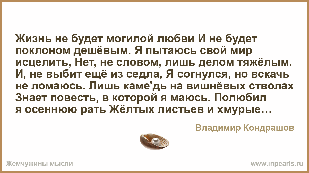 Жизнь не будет могилой любви И не будет поклоном дешёвым. Я пытаюсь свой мир исцелить, Нет, не словом, лишь делом тяжёлым. И, не выбит ещё из седла, Я согнулся, но вскачь не ломаюсь. Лишь каме'дь на вишнёвых стволах Знает повесть, в которой я маюсь. Полюбил я осеннюю рать Жёлтых листьев и хмурые дали. Ты меня не пытайся понять, Ведь других понимаю едва ли. Можно видеть, но сложно познать. Не кричите же Богу: — Доколе Злым и тёмным дано истреблять Даже святости зёрна и доли. Полюбите любовь ни за что, За больной ледоход, хоть в стакане, С многоточием и с запятой, Даже с фигой в руке и в кармане. И поверьте, что вера честна И не знает хромых проволочек, И не знает, что вера  — она. Обнимает вас, бьёт и пророчит.