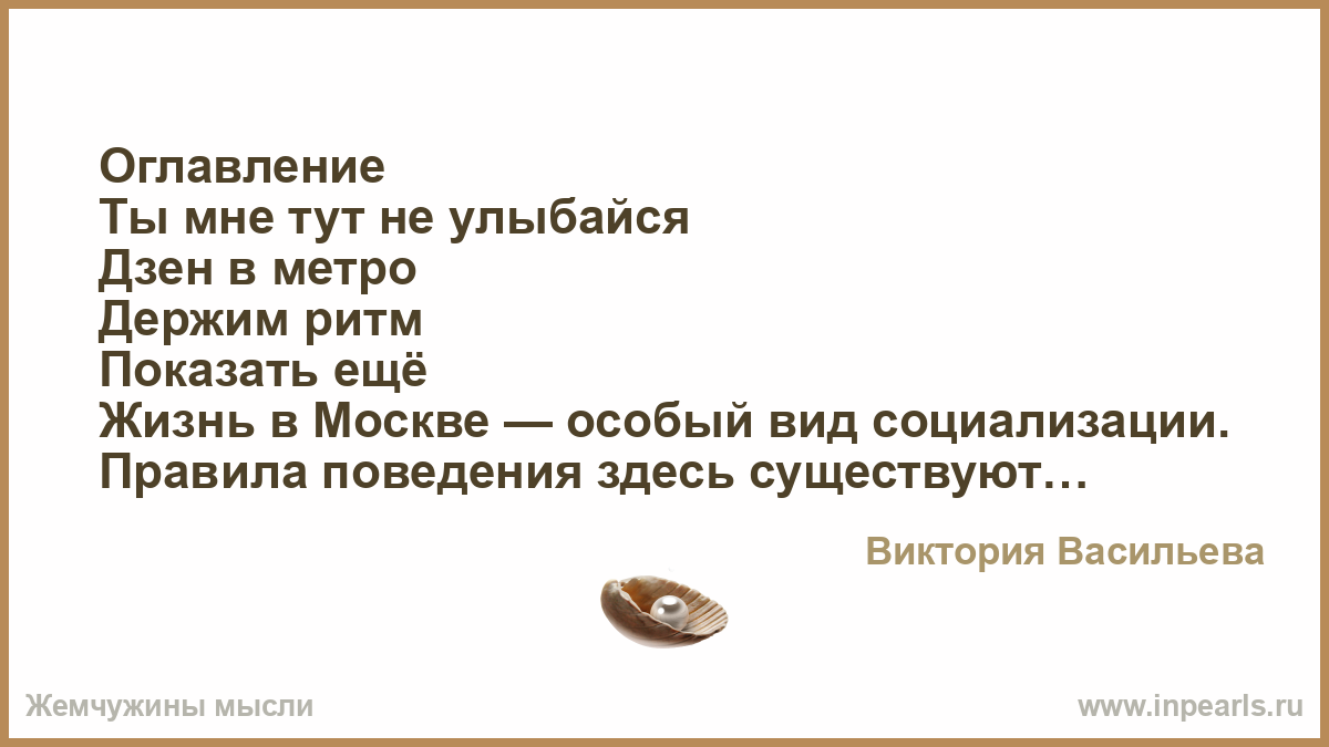 В метро своя атмосфера. Люди здесь ближе друг к другу, чем гости на свадьбе. Но даже если в вагоне айфону негде упасть, важно делать такое лицо, словно других людей не существует. Разглядывать пассажиров — дурной тон. Пристальный взгляд продолжительностью более двух секунд считается либо актом агрессии, либо безудержным флиртом. Смотреть можно в телефон, на схему метро, на экраны с видео, на бесконечный тоннель за окном. Истинный мастер смотрит в пустоту.