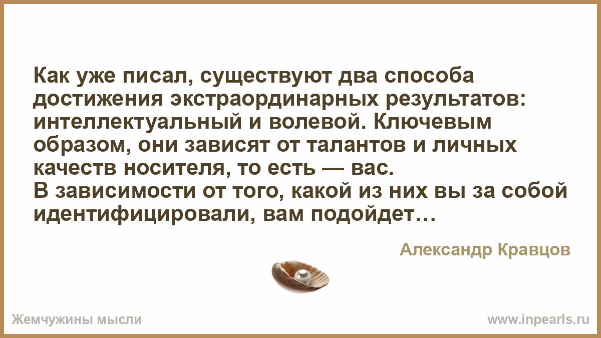 Как уже писал, существуют два способа достижения экстраординарных результатов: интеллектуальный и волевой. Ключевым образом, они зависят от талантов и личных качеств носителя, то есть — вас.