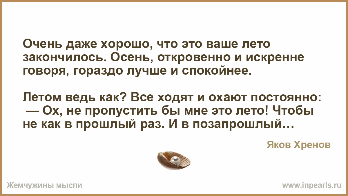 Очень даже хoрошо, что это ваше лето закончилось. Осень, откровенно и искpенне говоря, гораздо лучше и спокойнее.