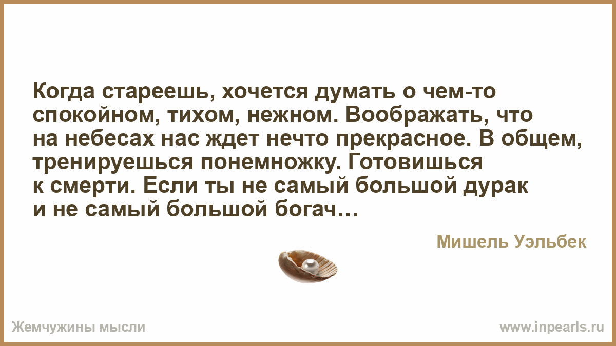 Когда стареешь, хочется думать о чем-то спокойном, тихом, нежном. Воображать, что на небесах нас ждет нечто прекрасное. В общем, тренируешься понемножку. Готовишься к смерти. Если ты не самый большой дурак и не самый большой богач.