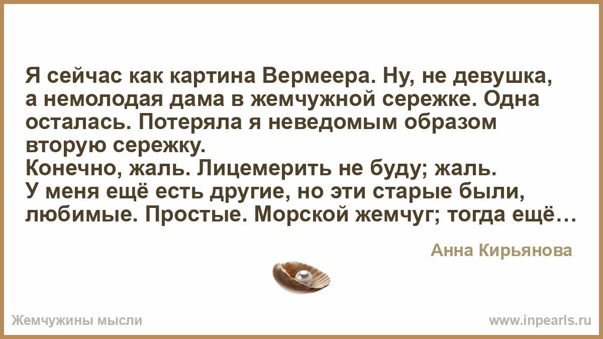 Я сейчас как картина Вермеера. Ну, не девушка, а немолодая дама в жемчужной сережке. Одна осталась. Потеряла я неведомым образом вторую сережку.