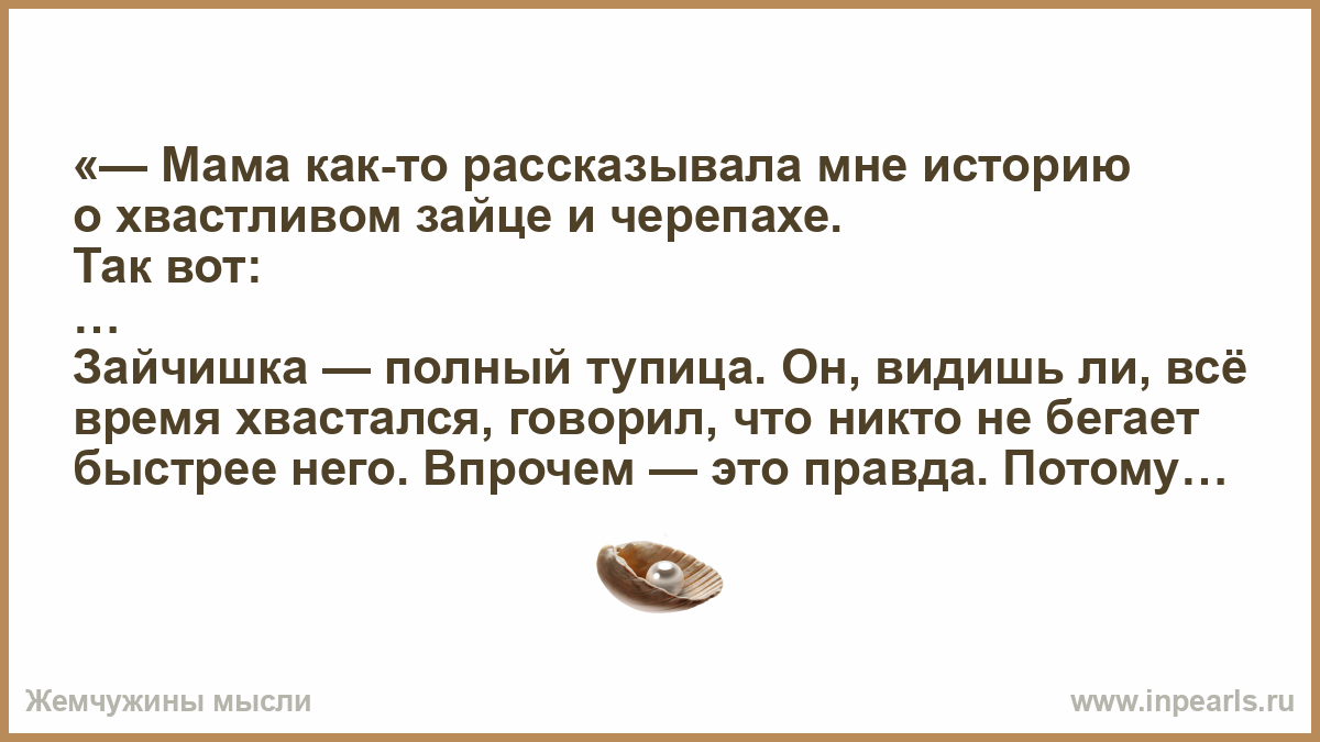 «— Мама как-то рассказывала мне историю о хвастливом зайце и черепахе.