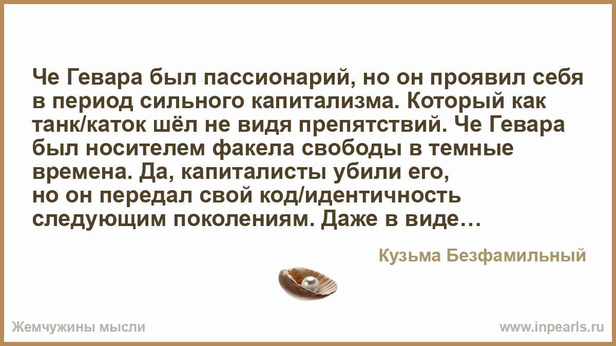 Че Гевара был пассионарий, но он проявил себя в период сильного капитализма. Который как танк/каток шёл не видя препятствий. Че Гевара был носителем факела свободы в темные времена. Да, капиталисты убили его, но он передал свой код/идентичность следующим поколениям. Даже в виде трафаретов на футболках идет передача идеи будущим поколениям. Это всё план Провидения. Который парадоксален и не предсказуем для нас, простых смертных.