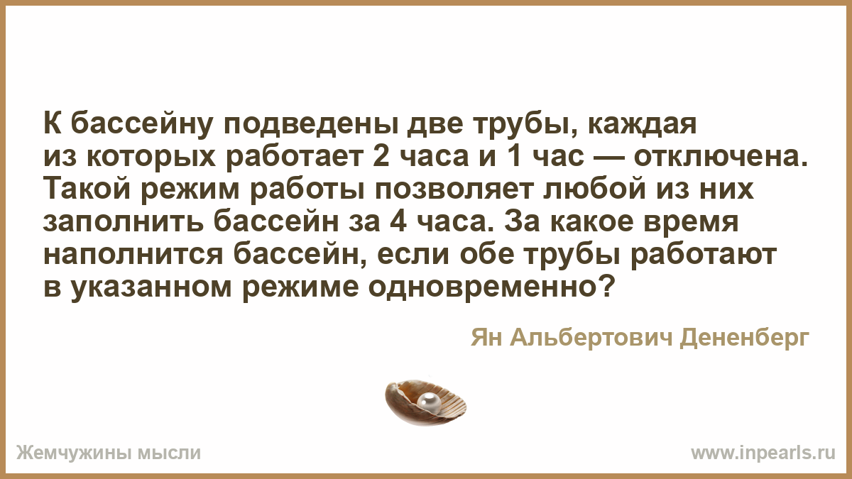К бассейну подведены две трубы, каждая из которых работает 2 часа и 1 час — отключена. Такой режим работы позволяет любой из них заполнить бассейн за 4 часа. За какое время наполнится бассейн, если обе трубы работают в указанном режиме одновременно?