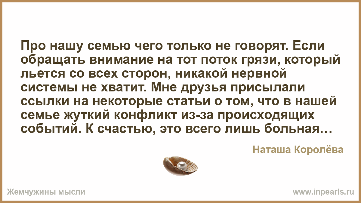 Про нашу семью чего только не говорят. Если обращать внимание на тот поток грязи, который льется со всех сторон, никакой нервной системы не хватит. Мне друзья присылали ссылки на некоторые статьи о том, что в нашей семье жуткий конфликт из-за происходящих событий. К счастью, это всего лишь больная фантазия людей, которые считают себя «журналистами». У нас в семье все хорошо. Бывают шероховатости, разные взгляды на вещи и события. Но такое случается во многих семьях. Чтобы закончить историю с этими разговорами, скажу, что, пока мама гостит у нас в Москве, мы живем все вместе на даче. И в нашей семье поддерживаем дружелюбное настроение. Наверное, это и есть ответ на ваш вопрос.