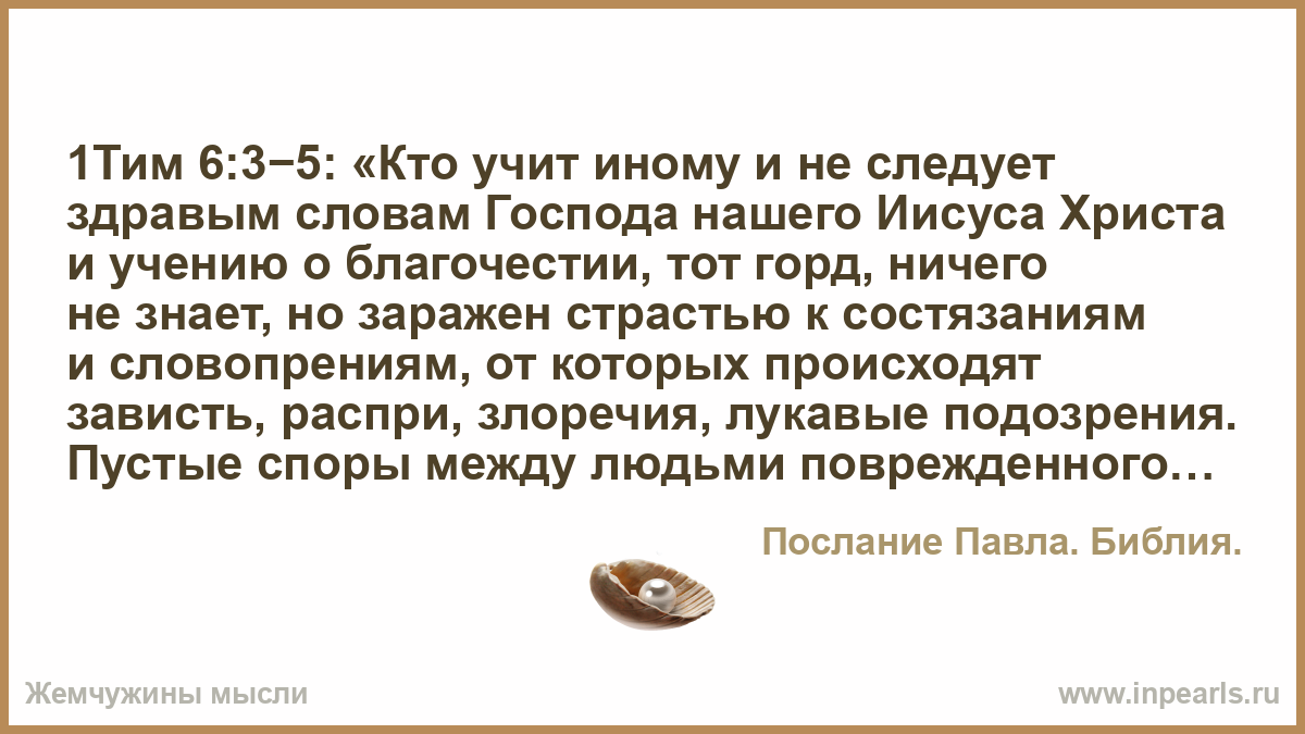 1Тим 6:3−5: «Кто учит иному и не следует здравым словам Господа нашего Иисуса Христа и учению о благочестии, тот горд, ничего не знает, но заражен страстью к состязаниям и словопрениям, от которых происходят зависть, распри, злоречия, лукавые подозрения. Пустые споры между людьми поврежденного ума, чуждыми истины, которые думают, будто благочестие служит для прибытка. Удаляйся от таких.»