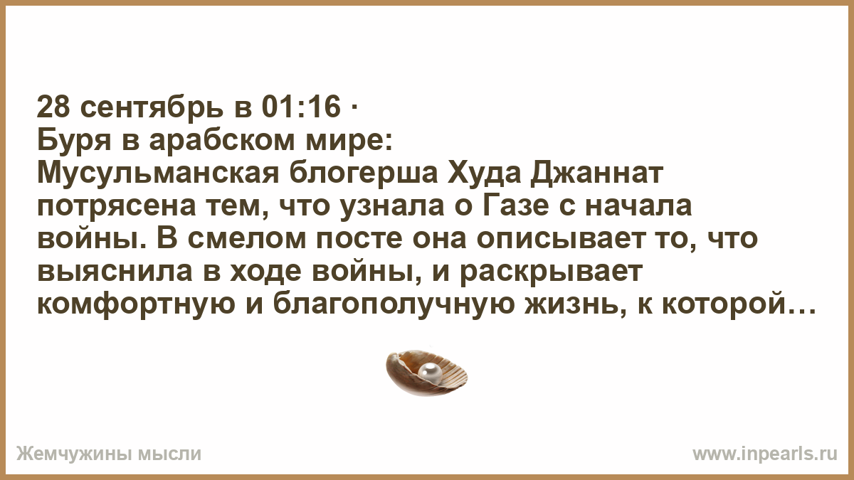Мусульманская блогерша Худа Джаннат потрясена тем, что узнала о Газе с начала войны. В смелом посте она описывает то, что выяснила в ходе войны, и раскрывает комфортную и благополучную жизнь, к которой привыкли жители Газы и лидеры ХАМАС благодаря уступкам Израиля. Пост разоблачает лицемерие ХАМАС относительно якобы ужасного положения жителей Газы до войны.