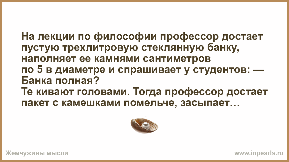 Те кивают головами. Тогда профессор достает пакет с камешками помельче, засыпает их в банку и снова спрашивает: — А теперь? — Да, теперь полная.