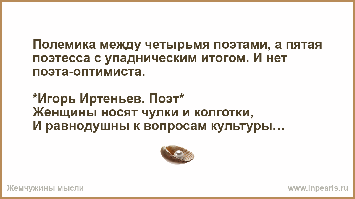 Полемика между четырьмя поэтами, а пятая поэтесса с упадническим итогом. И нет поэта-оптимиста.