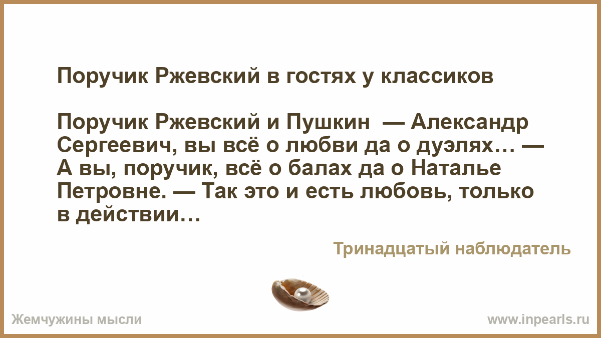 Поручик Ржевский и Пушкин — Александр Сергеевич, вы всё о любви да о дуэлях… — А вы, поручик, всё о балах да о Наталье Петровне. — Так это и есть любовь, только в действии!