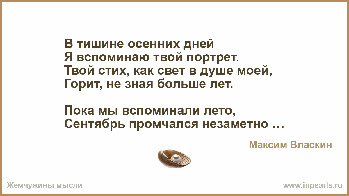 Пока мы вспоминали лето, Сентябрь промчался незаметно — Красивый, яркий, молодой! Октябрь, сдержанный и хмурый, Свою сыграет партитуру В симфонии осенней длинной. А там ноябрь романс старинный Для нас исполнит, подготовив Нам встречу с Зимушкой-зимой.