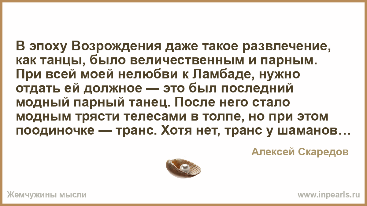 В эпоху Возрождения даже такое развлечение, как танцы, было величественным и парным. При всей моей нелюбви к Ламбаде, нужно отдать ей должное — это был последний модный парный танец. После него стало модным трясти телесами в толпе, но при этом поодиночке — транс. Хотя нет, транс у шаманов, а это какая-то массовая мастурбация.