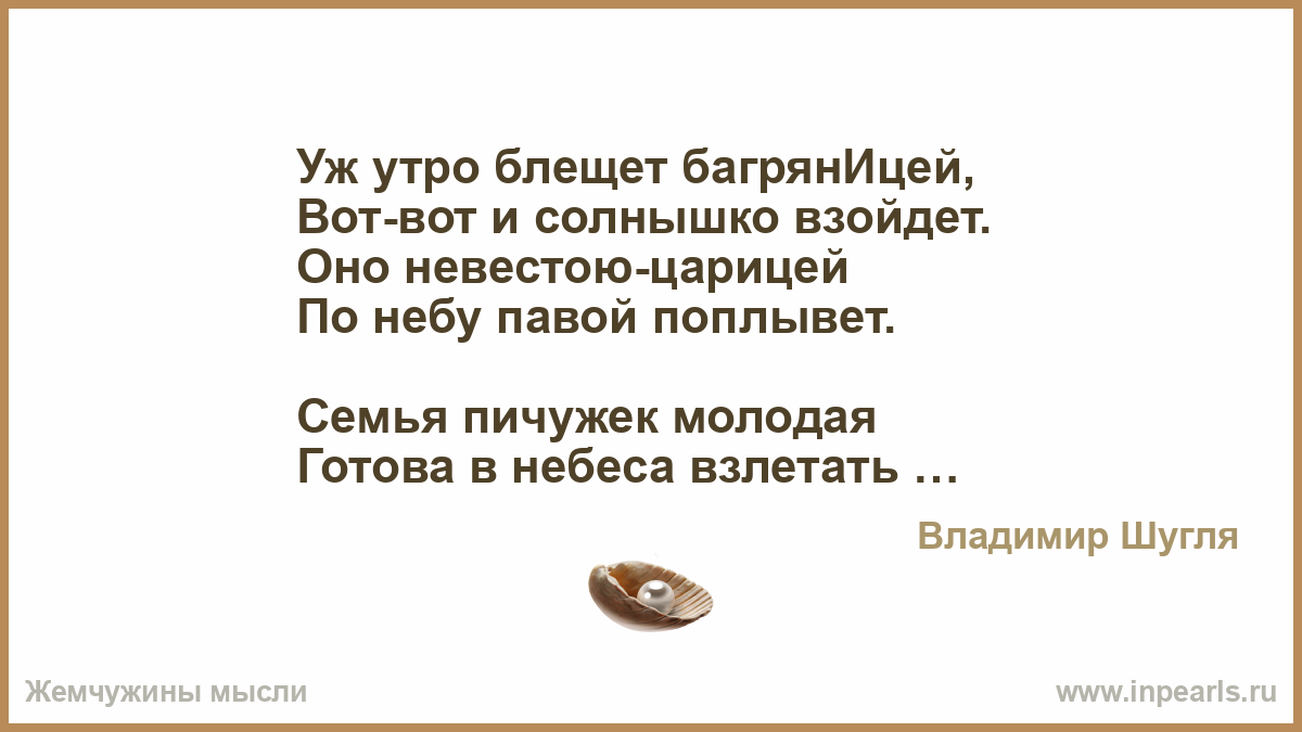 Доброе утро! …Проснуться от запаха СЧАСТЬЯ, Раздвинуть послушные шторы, Найти непогоду прекрасной. Прихлёбывать кофе в уютном халате. Умыться, прибраться, одеться — И выйти из квартиры, Мурлыча любимую песню. Не думать, что было и будет, А жить — каждый день — как впервые В волшебном СЕГОДНЯ…