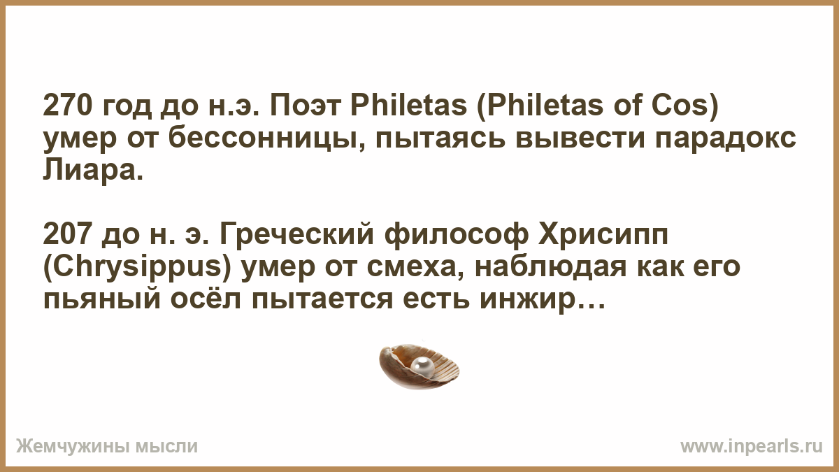 270 год до н.э. Поэт Philetas (Philetas of Cos) умер от бессонницы, пытаясь вывести парадокс Лиара.