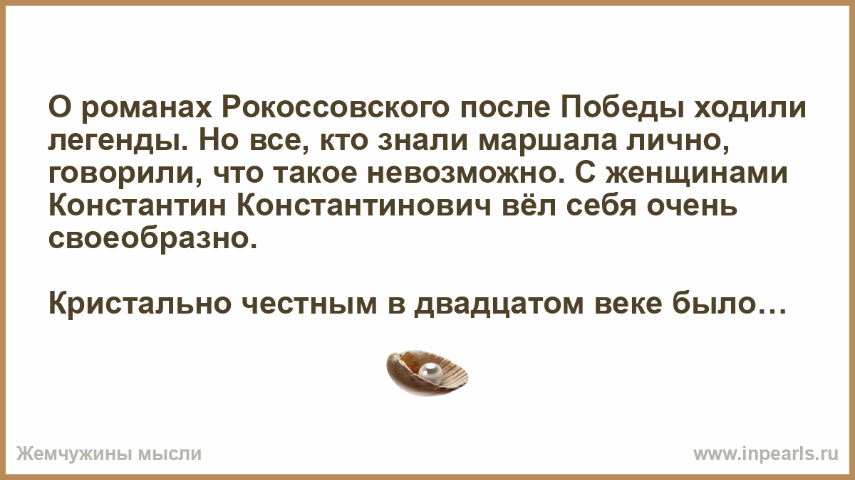 О романах Рокоссовского после Победы ходили легенды. Но все, кто знали маршала лично, говорили, что такое невозможно. С женщинами Константин Константинович вёл себя очень своеобразно.