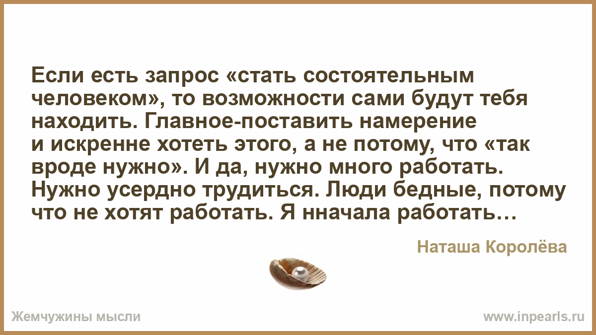 Если есть запрос «стать состоятельным человеком», то возможности сами будут тебя находить. Главное-поставить намерение и искренне хотеть этого, а не потому, что «так вроде нужно». И да, нужно много работать. Нужно усердно трудиться. Люди бедные, потому что не хотят работать. Я нначала работать с 14 лет на летних каникулах. Я тогда хотела быть самостоятельной и зарабатывать свои деньги.