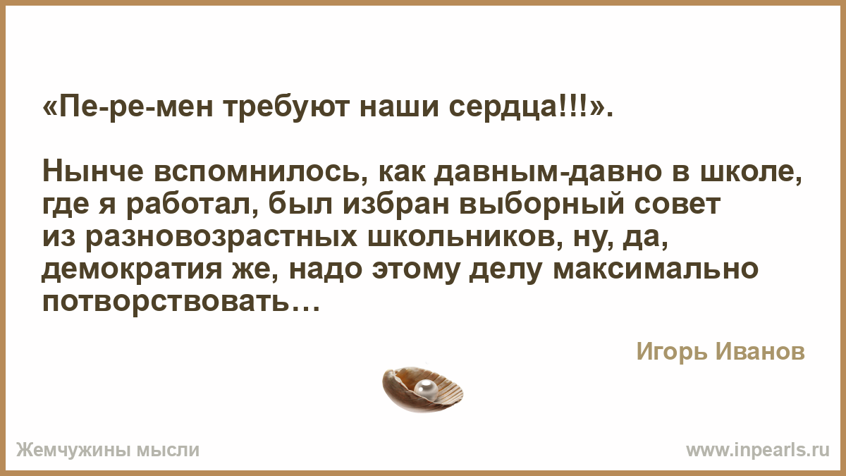 Нынче вспомнилось, как давным-давно в школе, где я работал, был избран выборный совет из разновозрастных школьников, ну, да, демократия же, надо этому делу максимально потворствовать.