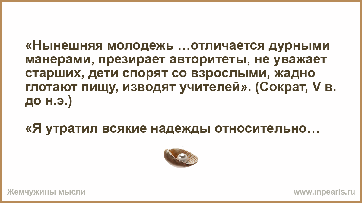 «Нынешняя молодежь …отличается дурными манерами, презирает авторитеты, не уважает старших, дети спорят со взрослыми, жадно глотают пищу, изводят учителей». (Сократ, V в. до н.э.)