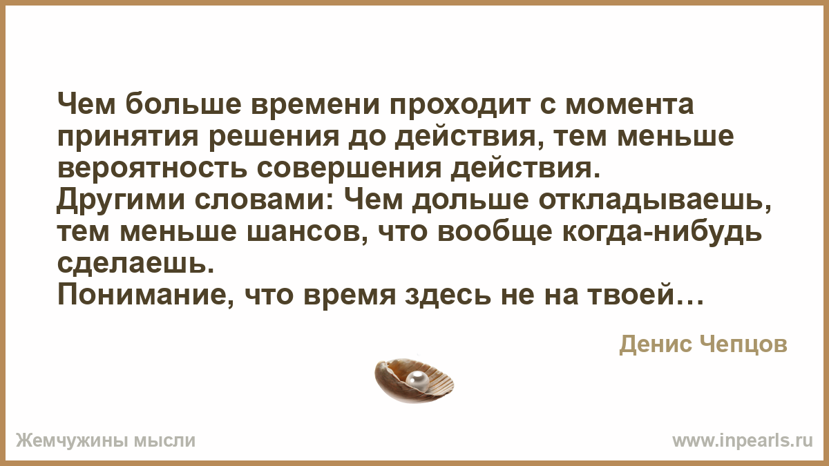 Другими словами: Чем дольше откладываешь, тем меньше шансов, что вообще когда-нибудь сделаешь.