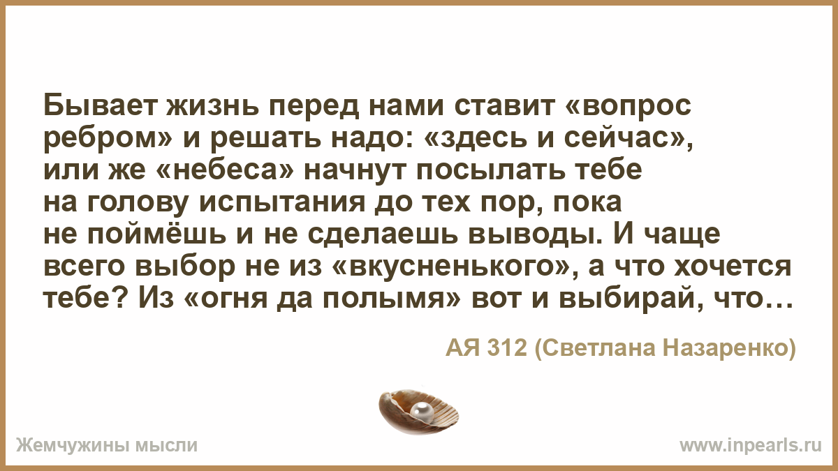 Бывает жизнь перед нами ставит «вопрос ребром» и решать надо: «здесь и сейчас», или же «небеса» начнут посылать тебе на голову испытания до тех пор, пока не поймёшь и не сделаешь выводы. И чаще всего выбор не из «вкусненького», а что хочется тебе? Из «огня да полымя» вот и выбирай, что себе удалишь ухо левое или правое? Да, никакое не хочу! Дорого одинаково всё, а надо, придется!!! Или будет хуже ещё и ещё, что я делаю в таком случае, наверное, ошибаюсь в том числе немного прислушиваюсь к тому, что вокруг кричит тебе, но… Решаю быстро: «Здесь и сейчас». Пожелание всем: слушать сердце и непременно прислушиваться ко Вселенной, почему к себе таки надо, а чтоб было потом кого винить… Высшие силы плохого не посоветуют, а вот дать по голове в качестве урока, могут легко. Хорошей всем слышимости от небес к сердцу, а от сердца к разуму.