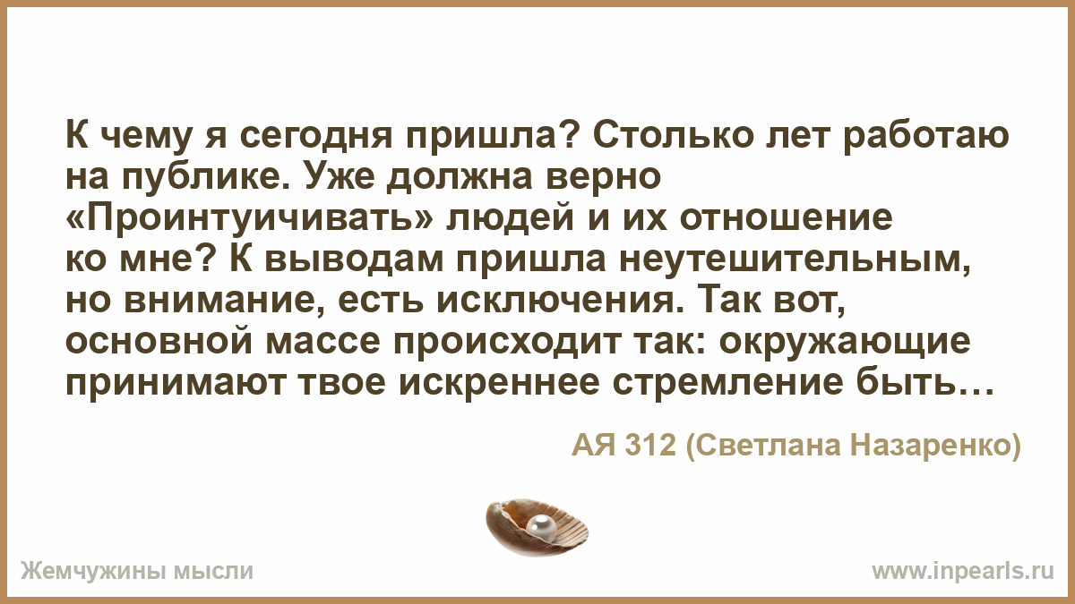 К чему я сегодня пришла? Столько лет работаю на публике. Уже должна верно «Проинтуичивать» людей и их отношение ко мне? К выводам пришла неутешительным, но внимание, есть исключения. Так вот, основной массе происходит так: окружающие принимают твое искреннее стремление быть внимательной, доброй, открытой за слабость и начинают действовать вполне открыто и стремительно: начинают давать свою субъективную оценку твоим действиям, окружающим тебя людям, когда что ты не разрешала вторгаться в твое личное пространство. В ответ на строгую реакцию: раздражение, обиды. Как это нельзя? Что за значит нельзя ковыряться грязным гвоздиком в ранке вашей души? А ты думаешь. И ведь человек хороший, но надо было раньше и строже обрисовывать свои личные границы, но ты же, типа не хочешь обижать человека. Надо, иначе постоянно будут обижать вас! Будут задевать за самое больное и дорогое сто процентов.