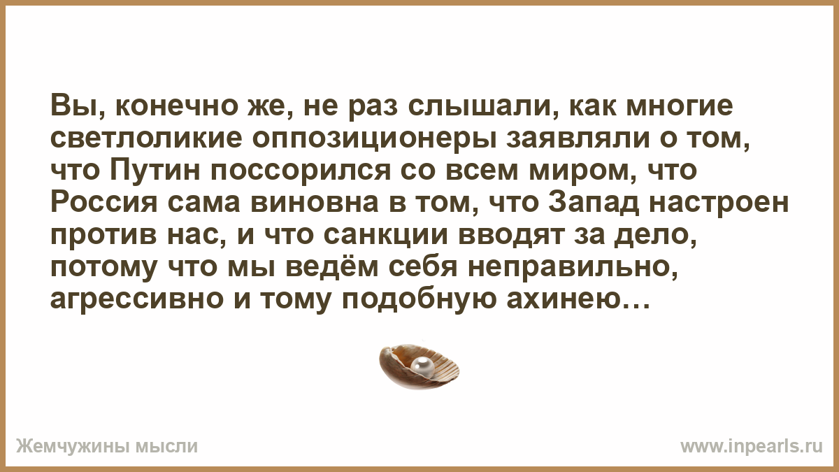 Вы, конечно же, не раз слышали, как многие светлоликие оппозиционеры заявляли о том, что Путин поссорился со всем миром, что Россия сама виновна в том, что Запад настроен против нас, и что санкции вводят за дело, потому что мы ведём себя неправильно, агрессивно и тому подобную ахинею.