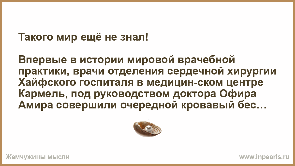 Впервые в истории мировой врачебной практики, врачи отделения сердечной хирургии Хайфского госпиталя в медицин-ском центре Кармель, под руководством доктора Офира Амира совершили очередной кровавый бес предел.
