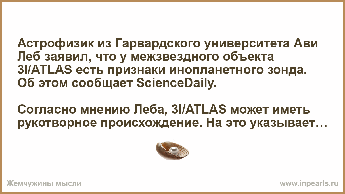 Астрофизик из Гарвардского университета Ави Леб заявил, что у межзвездного объекта 3I/ATLAS есть признаки инопланетного зонда. Об этом сообщает ScienceDaily.