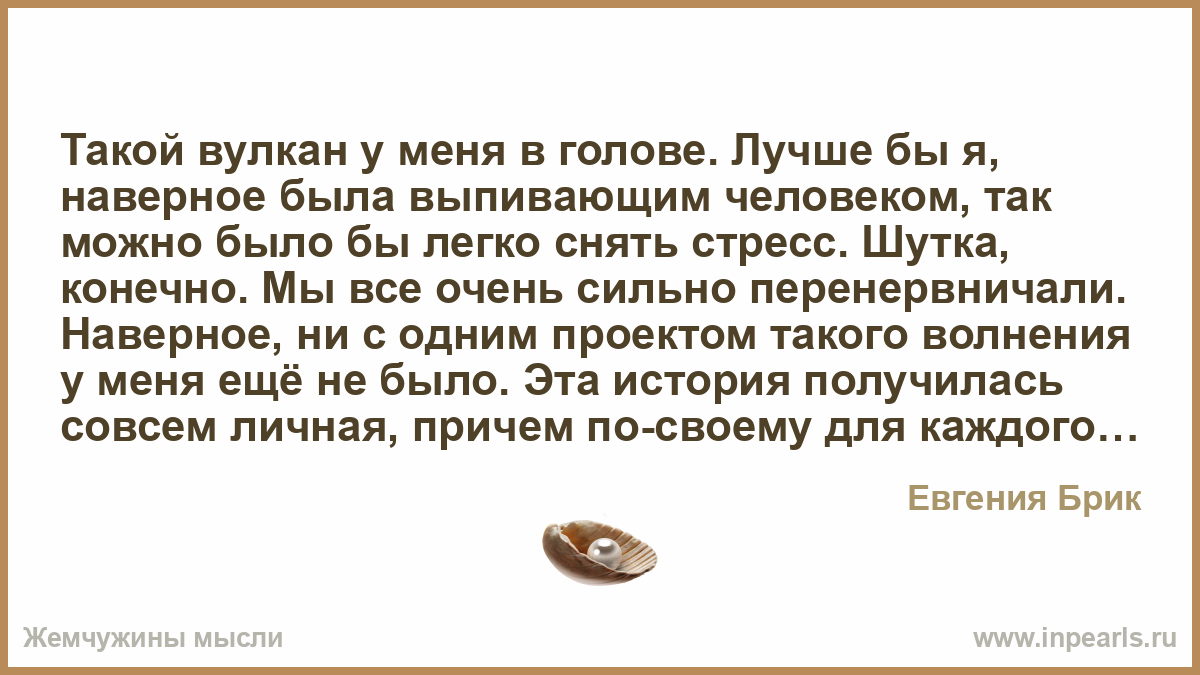 Такой вулкан у меня в голове. Лучше бы я, наверное была выпивающим человеком, так можно было бы легко снять стресс. Шутка, конечно. Мы все очень сильно перенервничали. Наверное, ни с одним проектом такого волнения у меня ещё не было. Эта история получилась совсем личная, причем по-своему для каждого из нас. А такое сокровенное всегда тяжело выставлять на показ. Так что, конечно, буря эмоций, ураган.