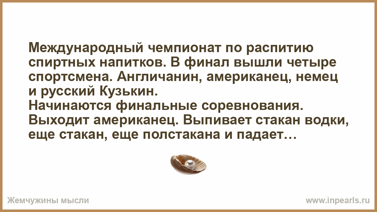 Международный чемпионат по распитию спиртных напитков. В финал вышли четыре спортсмена. Англичанин, американец, немец и русский Кузькин.