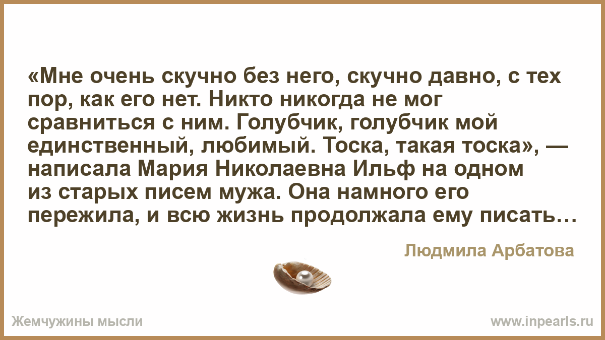 «Мне очень скучно без него, скучно давно, с тех пор, как его нет. Никто никогда не мог сравниться с ним. Голубчик, голубчик мой единственный, любимый. Тоска, такая тоска», — написала Мария Николаевна Ильф на одном из старых писем мужа. Она намного его пережила, и всю жизнь продолжала ему писать.